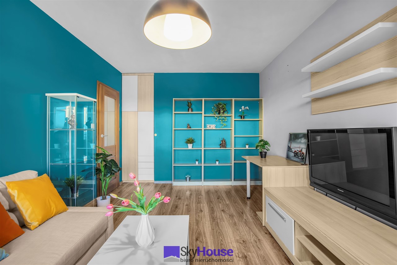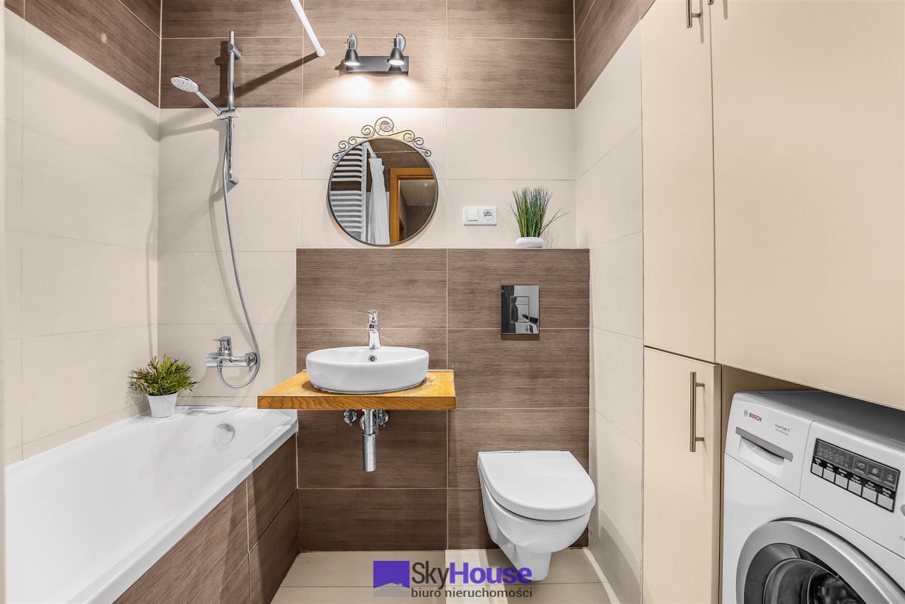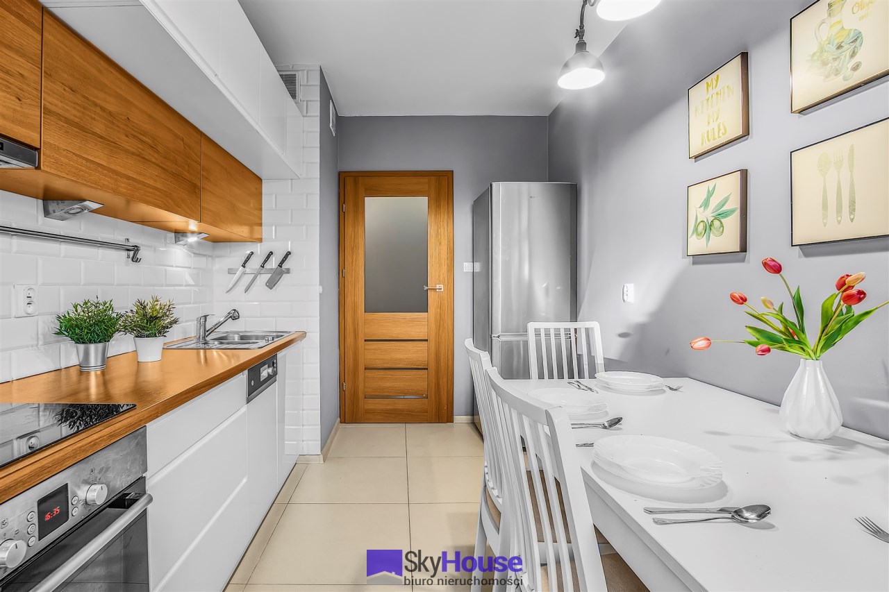 Mieszkanie jest zadbane, wygodne do życia, w pełni umeblowane i wyposażone w niezbędny sprzęt AGD (piekarnik, płyta indukcyjna, zmywarka, lodówko-zamrażarka). W pokoju dziennym kanapa, regały, szafa w zabudowie. W sypialni podwójne łóżko z materacem, komoda, szafki nocne. Łazienka z wanną z funkcją prysznica, pralka w łazience 60 cm. W przedpokoju duża 3-drzwiowa szafa.