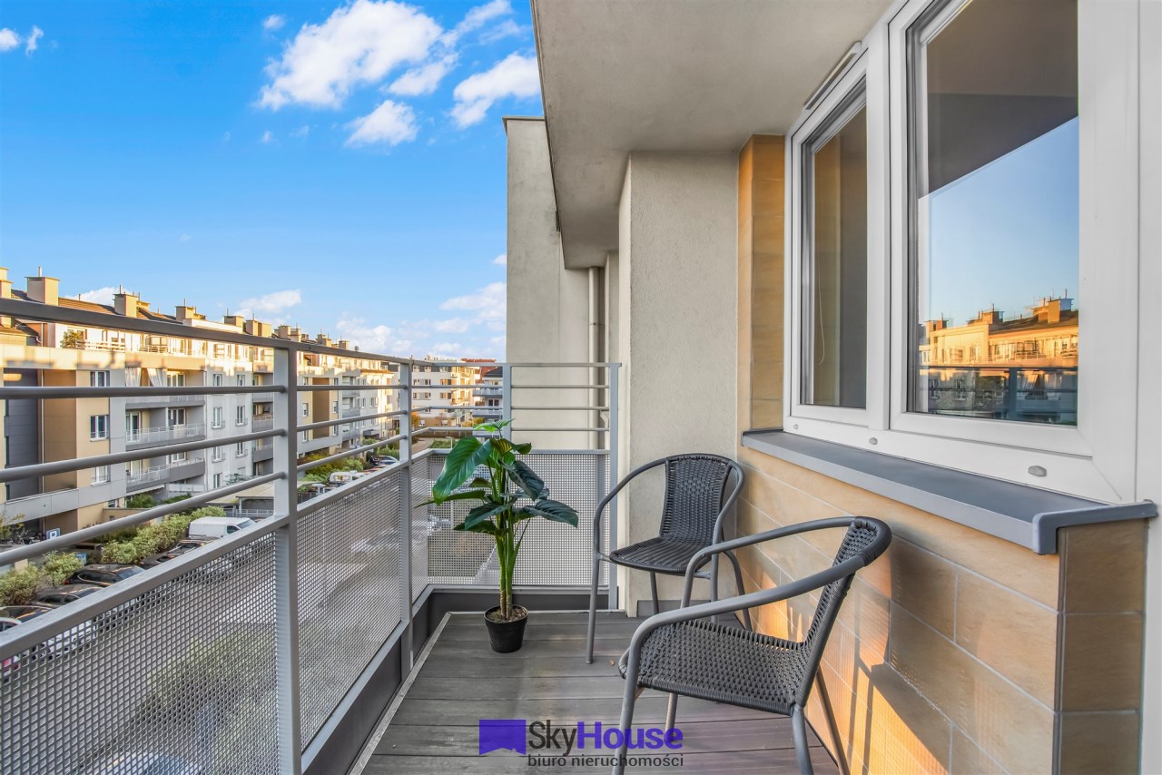 Okna mieszkania wychodzą na wewnętrzny dziedziniec, dzięki czemu jest ciszej i z dużą wygodą można korzystać z balkonu.