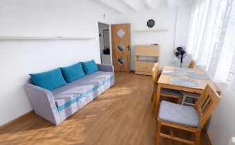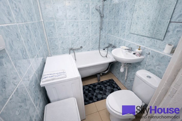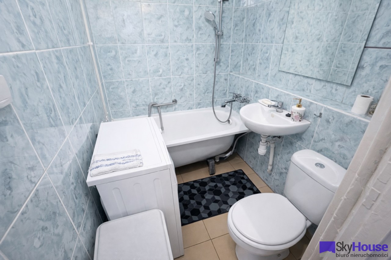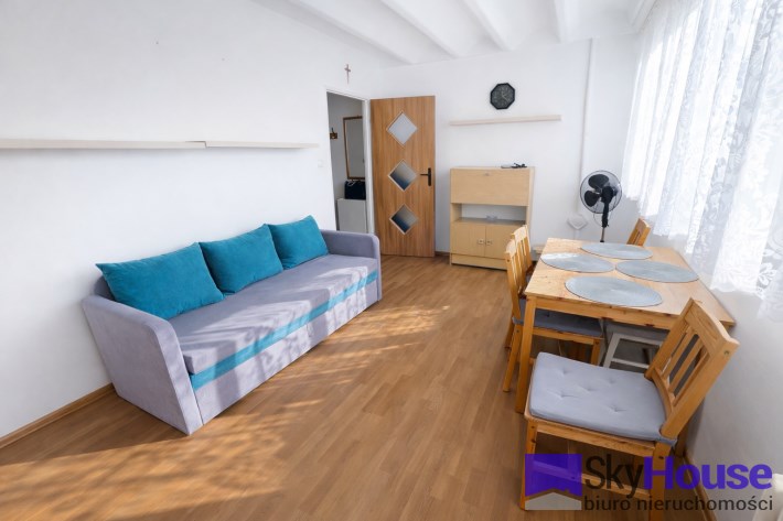 Mieszkanie jest w pełni wyposażone, gotowe do wynajęcia od zaraz. W pokoju dziennym rozkładana kanapa, stół z krzesłami, meble do przechowywania rzeczy. Kuchnia z meblami i sprzętem AGD (lodówka, kuchenka gazowa z piekarnikiem, naczynia do gotowania i spożywania posiłków). W łazience pralka. W przedpokoju wieszak na kurtki i miejsce na buty