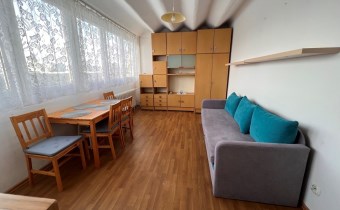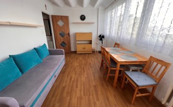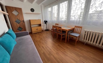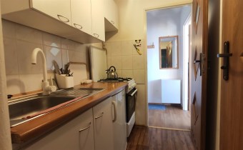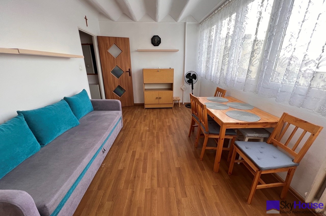 Mieszkanie jest w pełni wyposażone, gotowe do wynajęcia od zaraz. W pokoju dziennym rozkładana kanapa, stół z krzesłami, meble do przechowywania rzeczy. Kuchnia z meblami i sprzętem AGD (lodówka, kuchenka gazowa z piekarnikiem, naczynia do gotowania i spożywania posiłków). W łazience pralka. W przedpokoju wieszak na kurtki i miejsce na buty